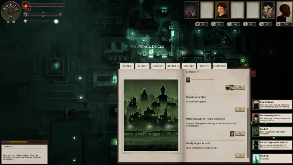Comparé à l'excellent 80 Days and Sorcery d'Inkle Studio ! titres de texte sur iOS, par exemple, la présentation textuelle de Sunless Sea semble décidément démodée, et c'est dommage que Failbetter Games ne fasse pas un meilleur usage de son script bien écrit. Par exemple, le journal pourrait facilement remplir tout l'écran plutôt que d'occuper une si petite proportion dans le coin droit, et quelques options d'histoire plus accessibles en dehors de la collecte de votre rapport initial permettraient au moins aux joueurs de sonder chaque île un peu plus loin. au cours des deux premières heures avant qu'ils ne repartent. Certes, de nouveaux contenus sont ajoutés tout le temps, mais dans l'état actuel des choses, chaque île peut rapidement se résumer à une poignée de clics avant que vous ne soyez à court d'options.